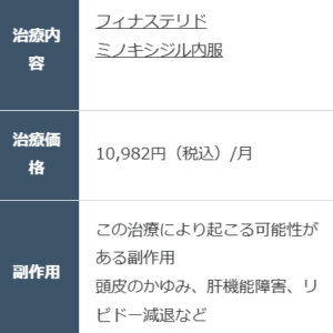 | 料金 | 初診・再診料無料(薬なし時は3,300円) フィナステリド:月3,800円〜 ミノキシジル外用:月5,780円〜 |